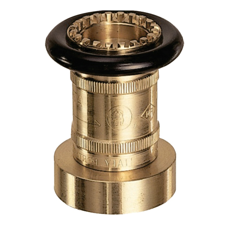 Boquilla importada para manguera contra incendio, fabricado en bronce forjado en acabado pulido, con sistema de descarga ajustable para chorro directo y tipo niebla con cierre mediante giro.