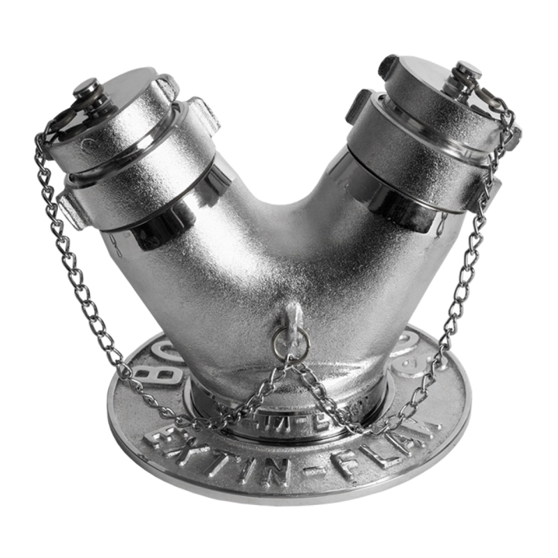 Cuenta con 2 entradas giratorias hembra de 2 1/2″ y 2 tapones macho de 2 1/2″, ambas con rosca NSHT y una salida de 4″ hembra con rosca NPT.